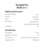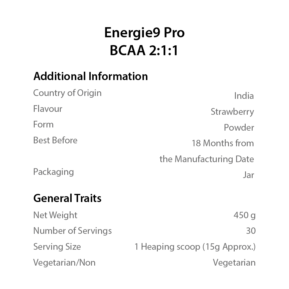 Energie9 Pro BCAA 2:1:1 is a premium intra-workout formulation with a perfect ratio of branched-chain amino acids, L-glutamine, citrulline malate, and electrolyte crafted for fitness enthusiasts that supports muscle recovery during workouts. L-Leucine, L-Isoleucine, and L-Valine are collectively called BCAA that help you in having a speedy recovery and enhanced muscle protein synthesis. Energie9 Pro BCAA is infused with electrolyte to replenish the lost minerals during sweating, rehydrate the body and help reduce fatigue. BCAA along with L-glutamine helps in muscle recovery. It provides 8.5g of BCAA per serving.