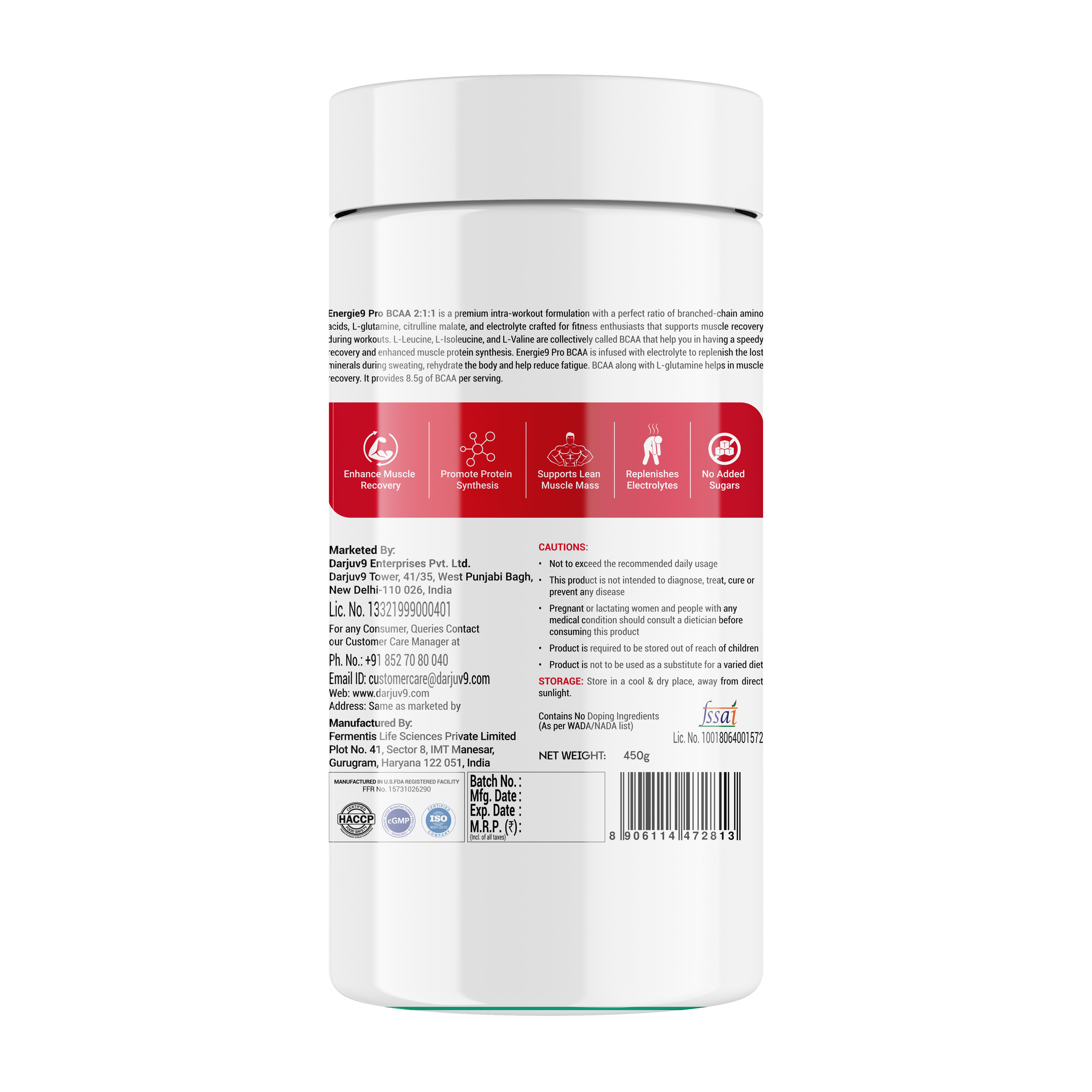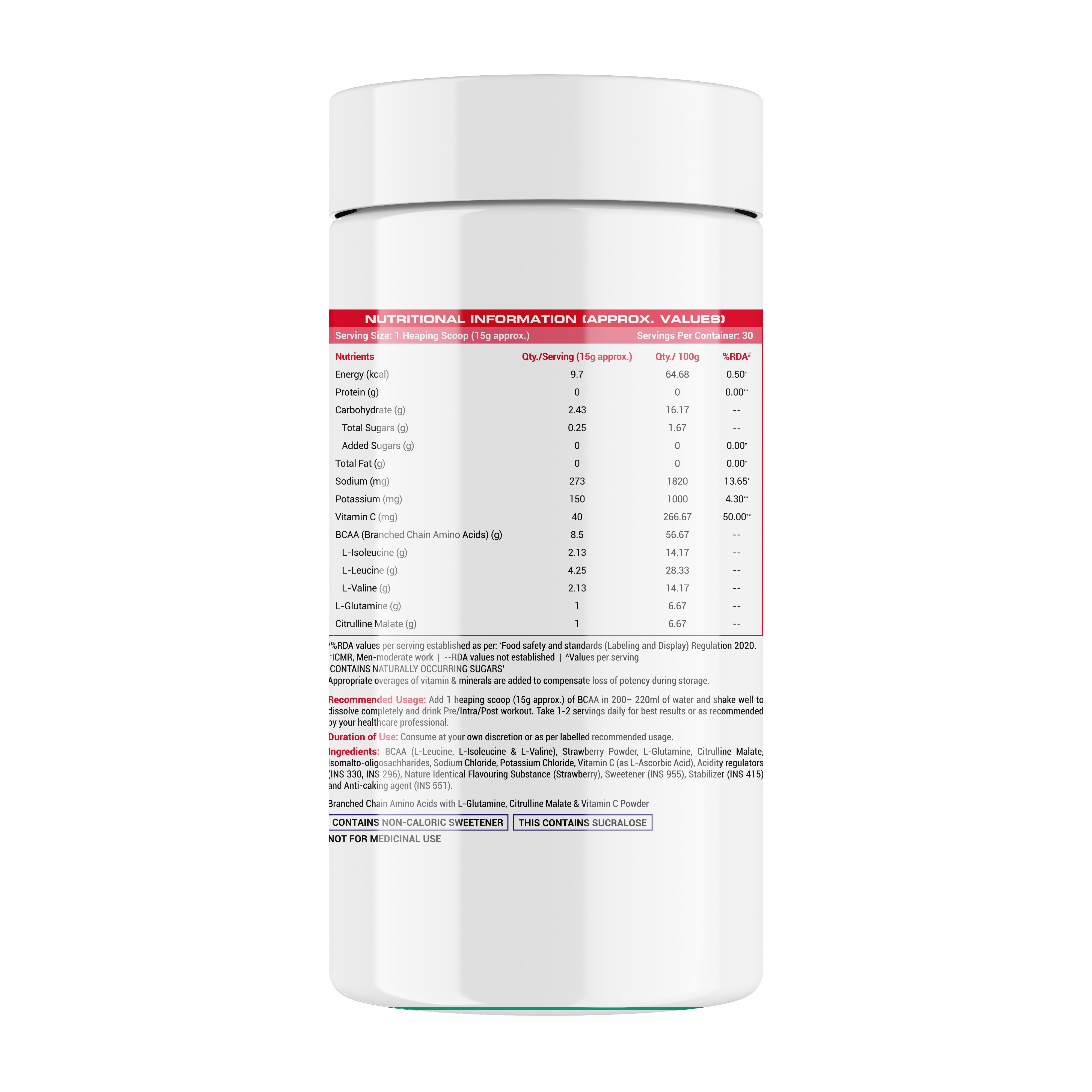 INGREDIENTS: BCAA (L-Leucine, L-Isoleucine & L-Valine), Strawberry Powder, L-Glutamine, Citrulline Malate, Isomalto-oligosachharides, Sodium Chloride, Potassium Chloride, Vitamin C (as L-Ascorbic Acid), Acidity regulators (INS 330, INS 296), Nature Identical Flavouring Substance (Strawberry), Sweetener (INS 955), Stabilizer (INS 415) and Anti-caking agent (INS 551).